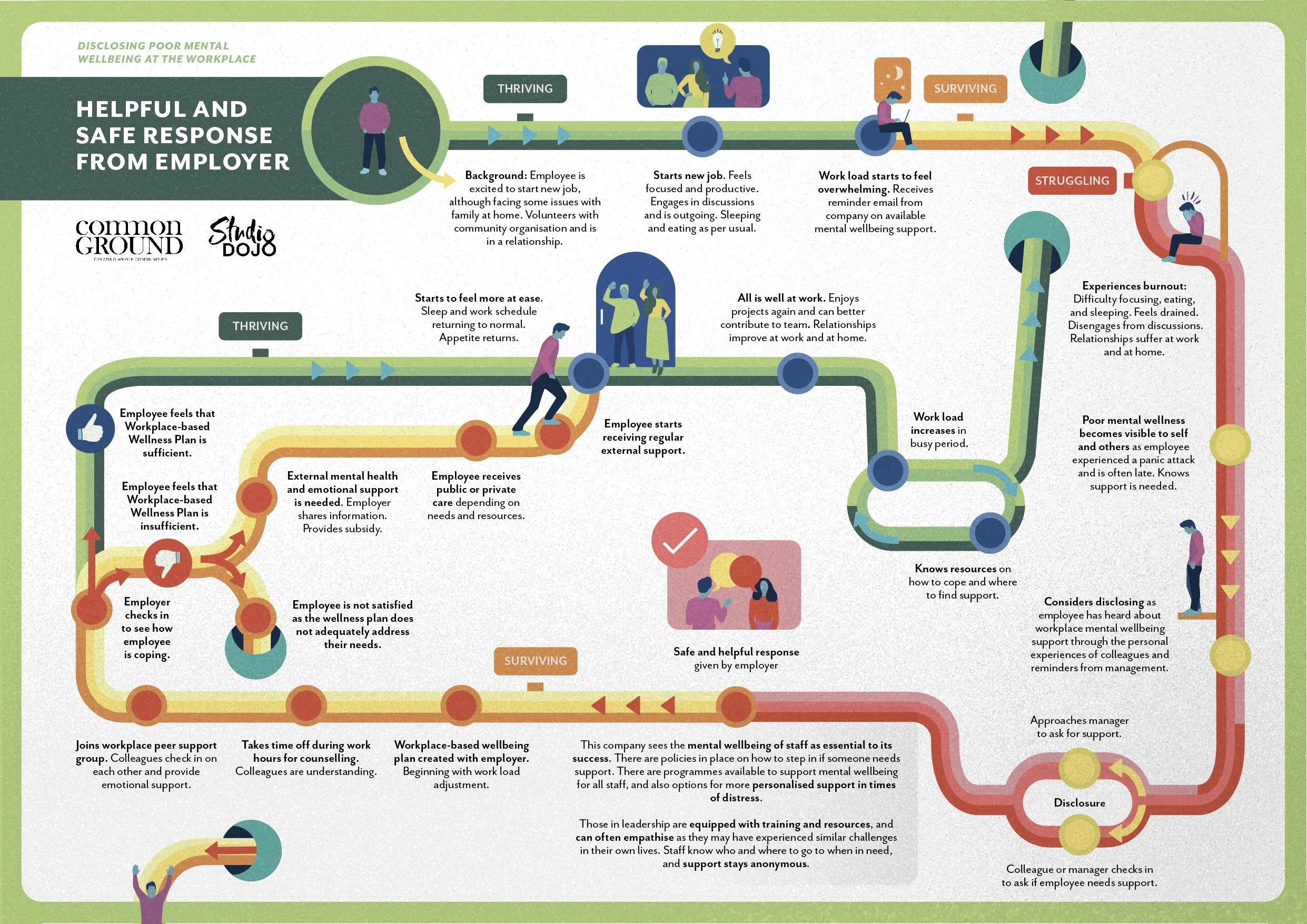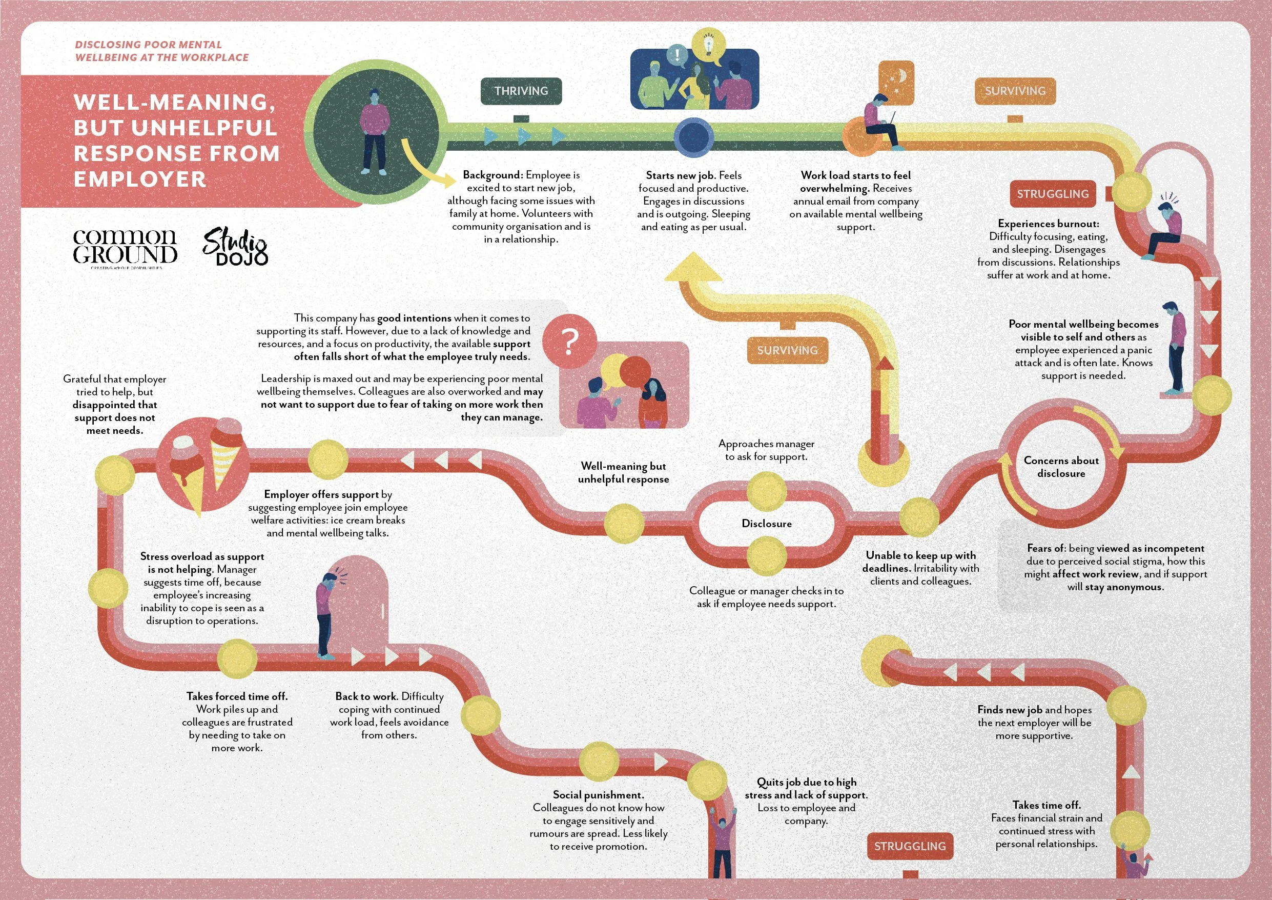 Objective: Visualize two journeys of an employee disclosing poor mental wellbeing at work, based upon 30 interviews with employees and 10 interviews with HR professionals and leaders from different sectors. One journey visualizes an employee who receives a safe and helpful response from an employer, and the other receives a well-meaning but unhelpful response. Ultimately, these maps were created to guide designers and organizations in the creation of their own workplace-based mental health interventions.